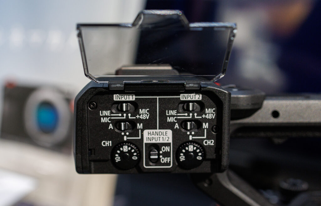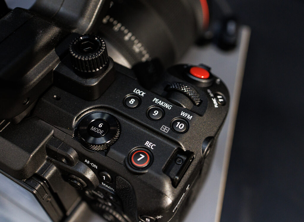 アサイン可能なボタンが並ぶボディ。RECボタン周囲のレバー部はパワーズームのレバーであると同時に、単焦点レンズ使用時にはデジタルズームのUIとして機能します。画質にどのくらい影響するかは実機で試せるようになってからの話ですが、RF85mm F1.4Lを絞り開放のままズームできるのは新鮮な感覚でした。