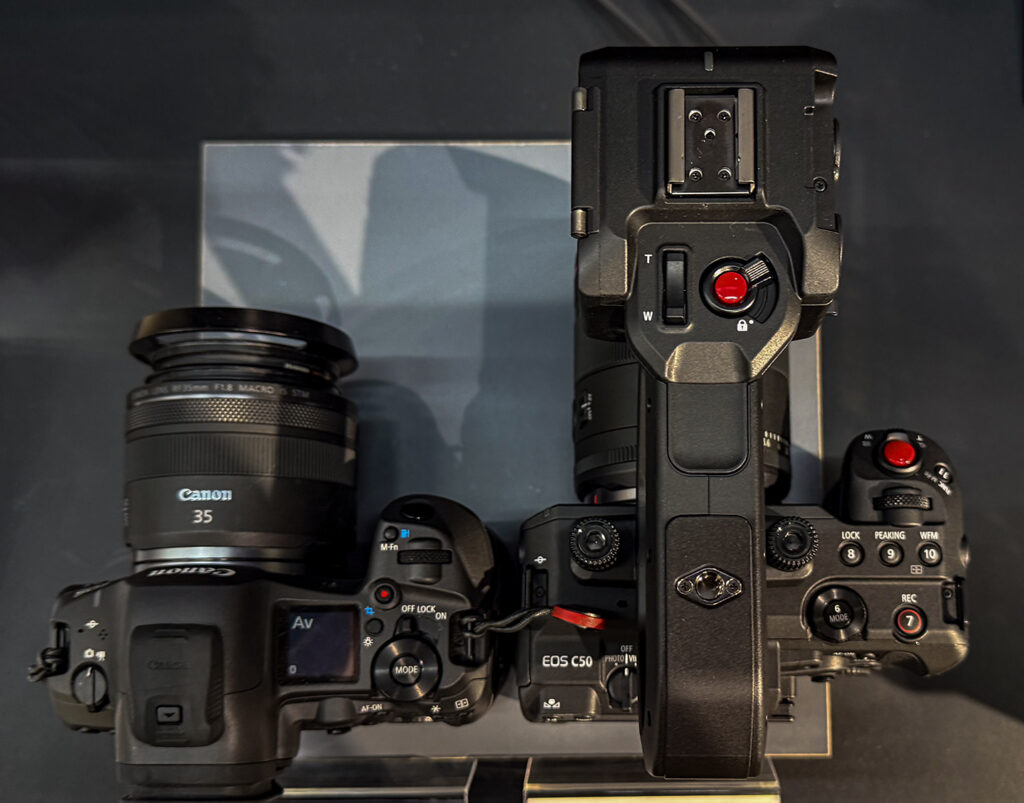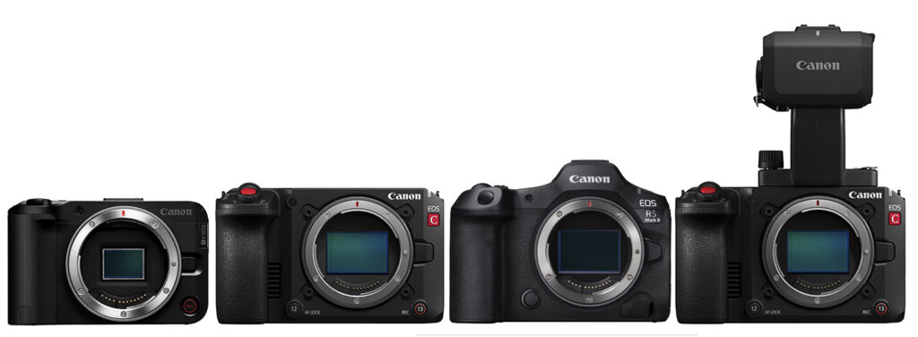 左から、EOS 50V、EOS C50(ボディ)、EOS R5 Mark II、EOS C50(ハンドルユニット装着状態)