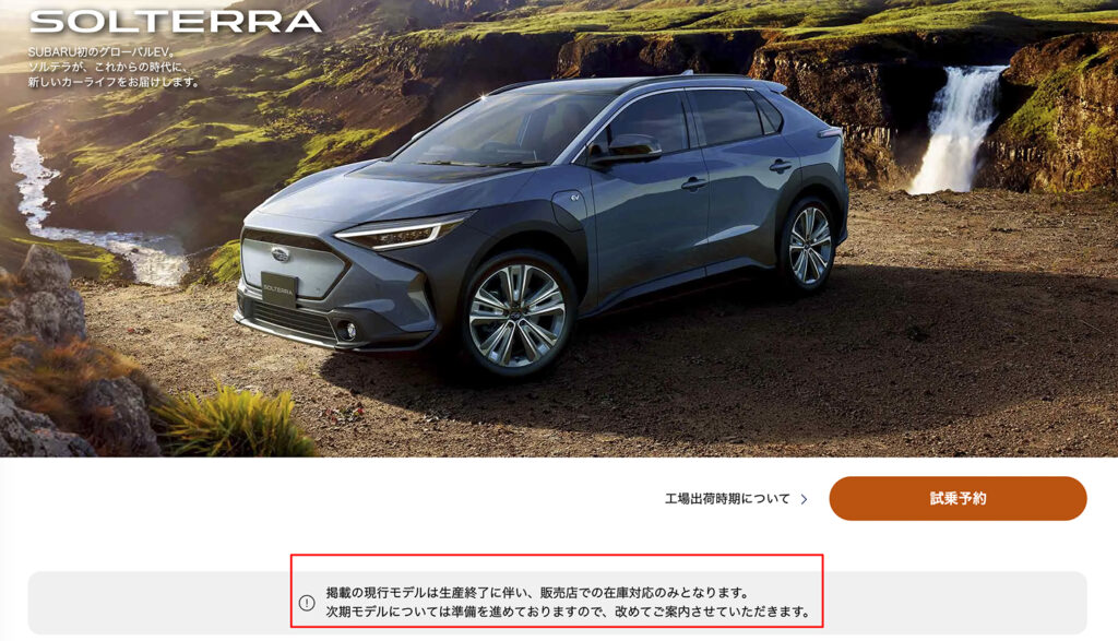 で、そういえばSUBARUのBEVであるソルテラはbZ4Xの姉妹車だけど、そっちはどうなるの?と思ったら、在庫限りの表示。