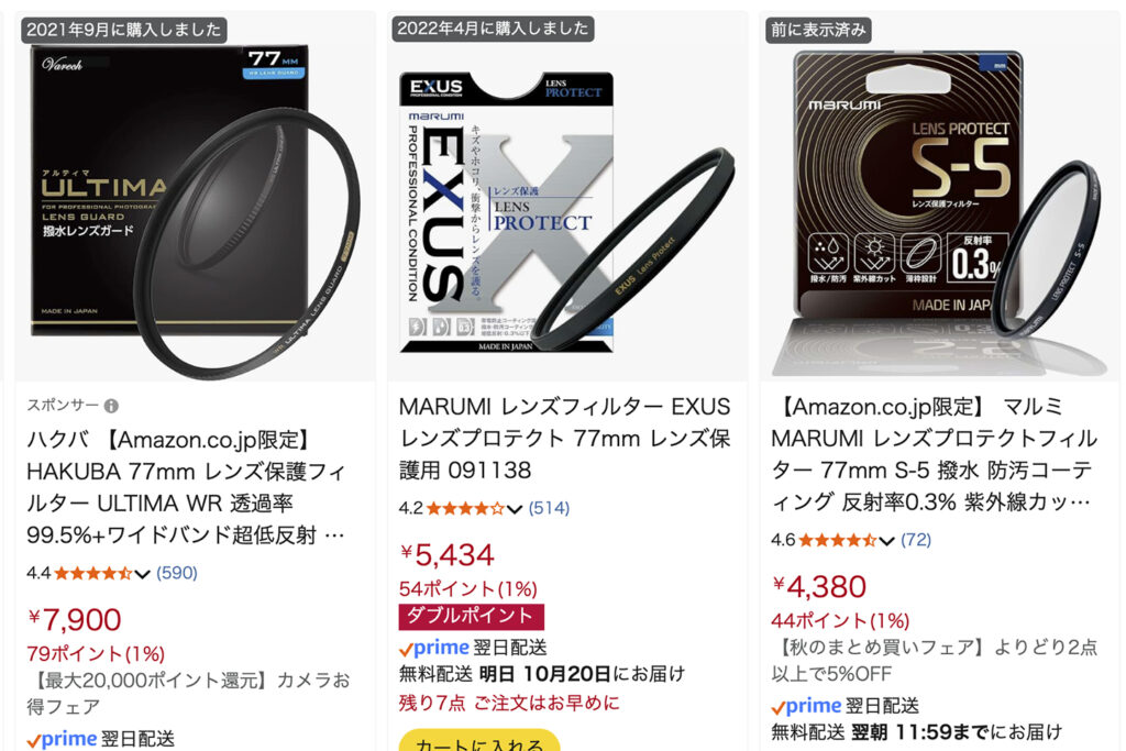 ので(?)安くはないけれど高価くもない範囲でレンズ保護フィルターを探します。