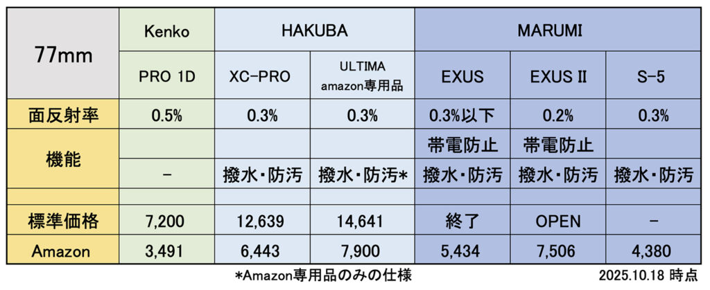 そしてAmazon専用品?としてMARUMI S-5なる製品が加わっています(マルミの公式ページには存在しない)。スペック的にはEXUS(初代:Amazon以外では事実上ディスコン)から帯電防止機能を削除したものにも思えますが、実際は不明です。それで1,000円以上安いので買ってみるかなあ。