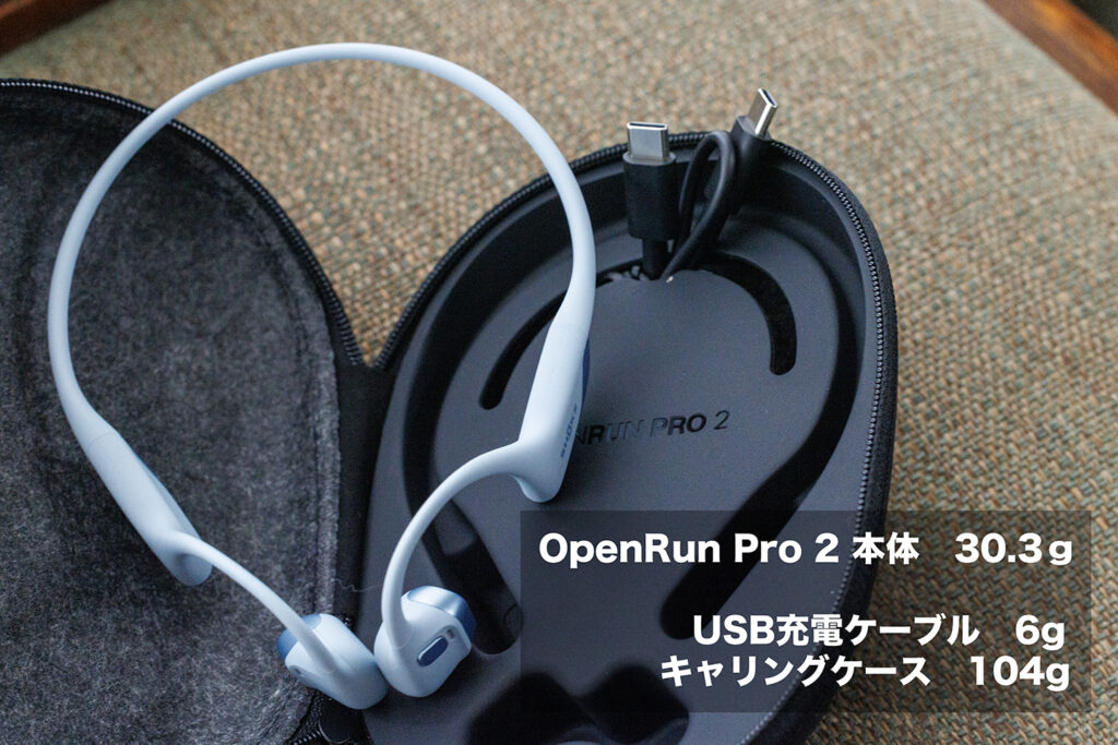 Shokz OpenRun Pro 2本体は30.3g(カタログ値)と非常に軽いのですが、このキャリングケースは104g(実測値)もあります。近年主流になっている完全独立ワイヤレスイヤホンが充電ケース込みで55〜70g前後で充電ケースも手のひらに収まるサイズであることを思うと、この重厚感?はかさばって重い、マイナスのイメージになっている気がします。
