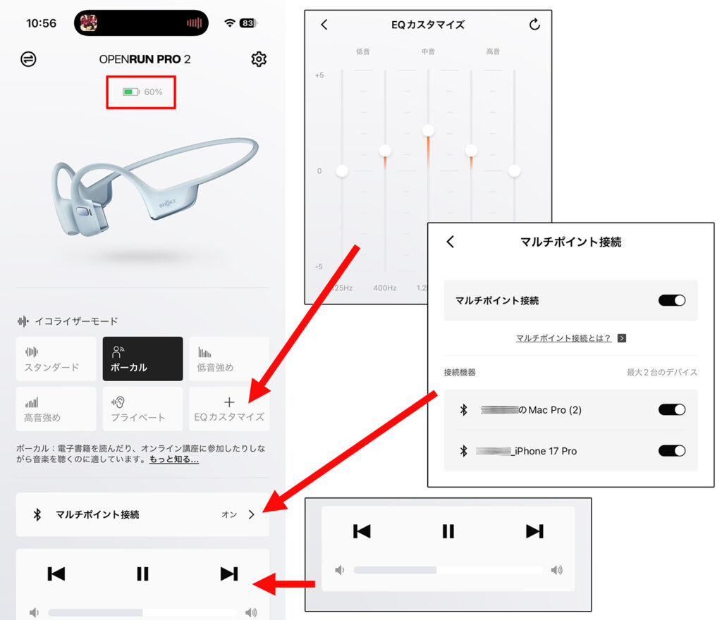 OpenRun Pro 2にはShokz共通のオーディオコントロールアプリがあり、スマホから各種の調整が可能です。(もちろんアプリなしでも基本操作は本体で可能です)