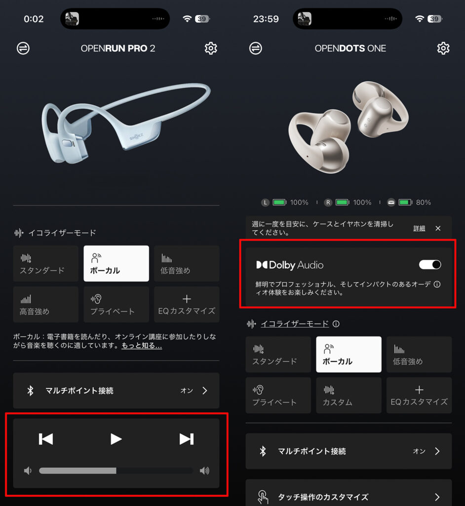 例えばShokz OpenRun Pro 2で出来るスキップ&音量コントロールはOpenDots ONEでは出来ません。そしてOpenDots ONEには Dolby Audioという大きな魅力が存在し、これをオンにすることで音に包まれるワンランク上のオーディオ体験が得られます。