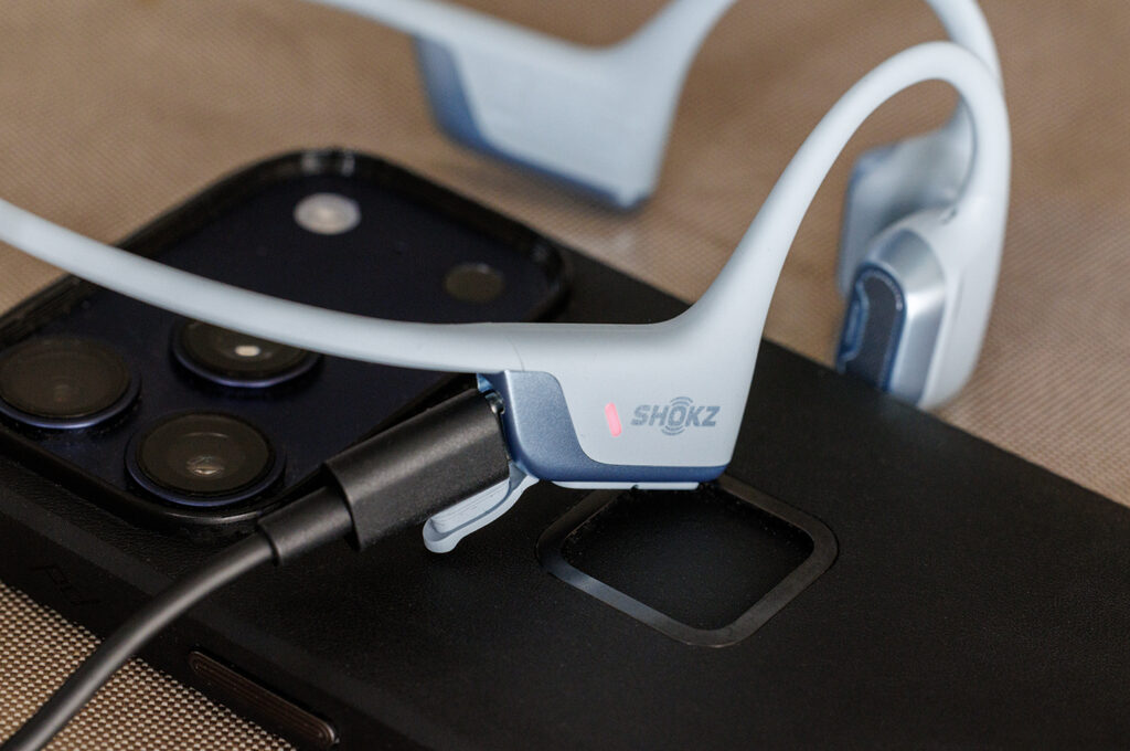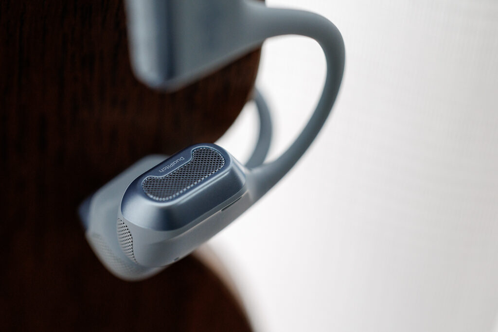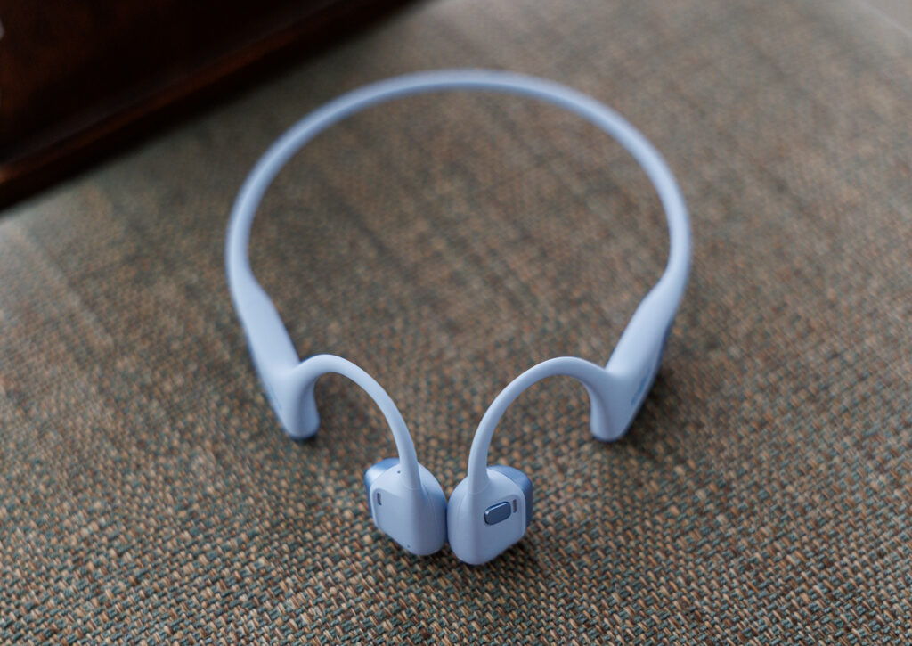 久しぶりの骨伝導イヤホンは、最近出た新色という柔らかなブルー。製品ページを見るとオレンジやオフホワイトに差し色が入ったモノが多く、すっかり垢抜けた印象。