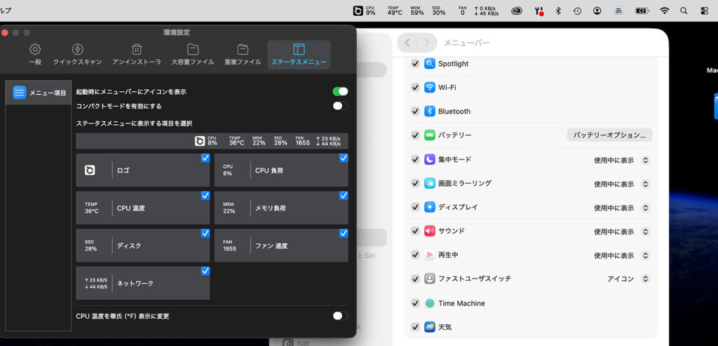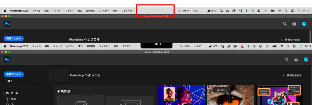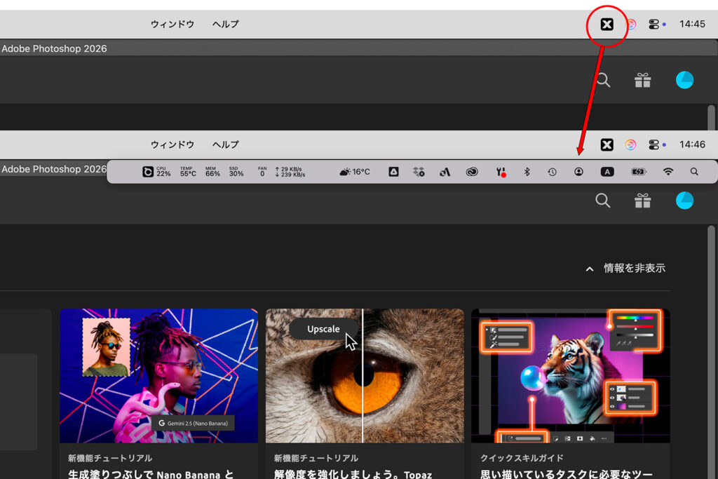 普段はmac osがノッチ(センサーハウジング)を避けてメニューバーを表示してくれますが、