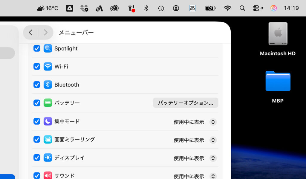 メニューバーに表示するアイコンが多いと、一部のアイコンが表示されません。