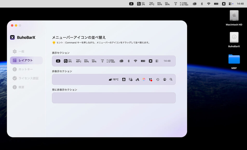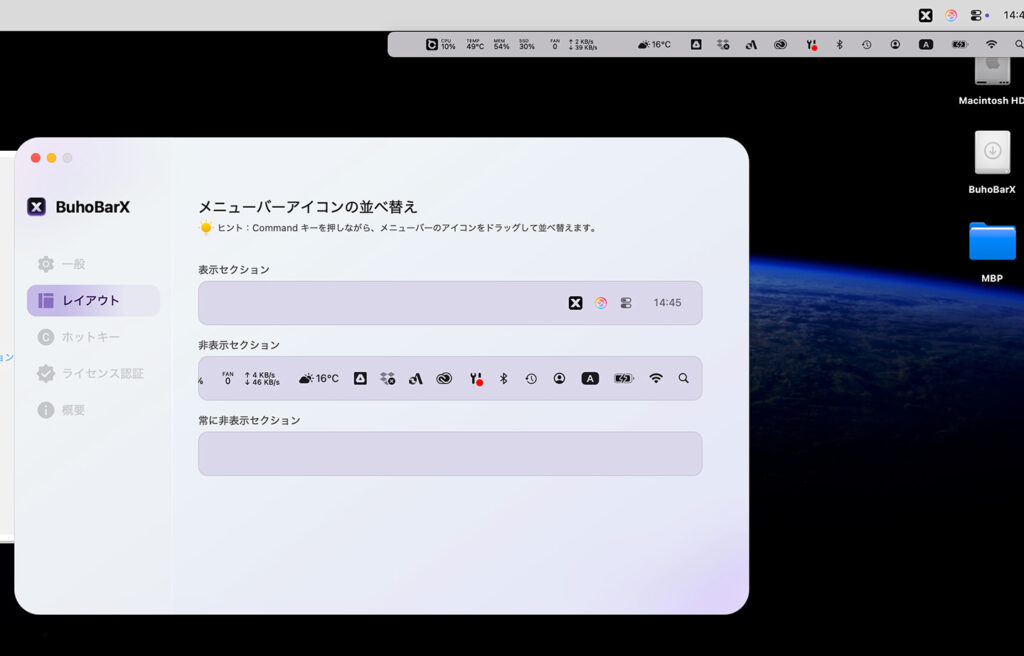 BuhoBarXをインストールすると、メニューバーのアイコンをすべて非表示にして、アイコンクリックで全表示してくれたり