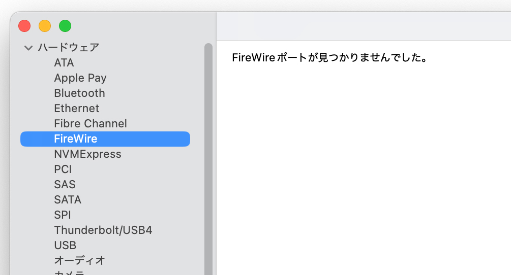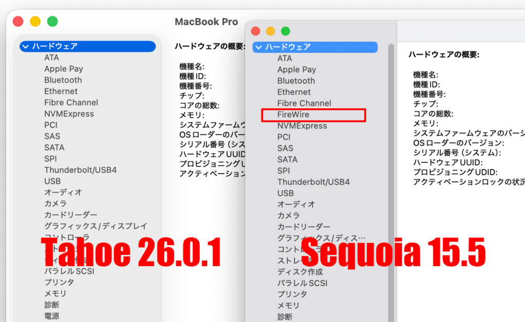 ふとmacOS Tahoeのシステム情報を見ていたら、何がが足りない、と思った。そう、FireWireの項目がないことに今頃気がついたのです。