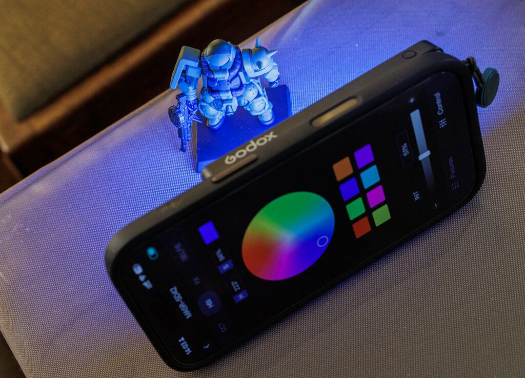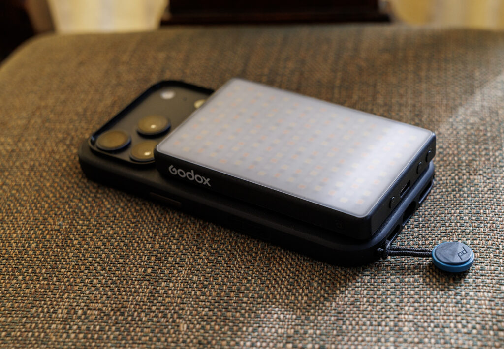 ただ、スマホとMagSafeで一体化させると、操作用のスクリーンが隠れてしまいます。だから、と言うわけではないと思いますが、Godox Lightというアプリをスマホにインストールすると