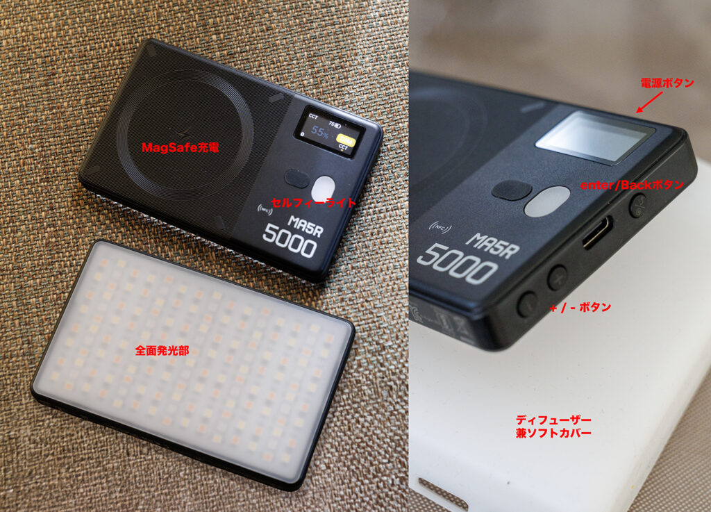 さらに自撮り用のミニライト、ディフューザーを兼ねたシリコンカバーが付属し、調光は本体だけでも可能。