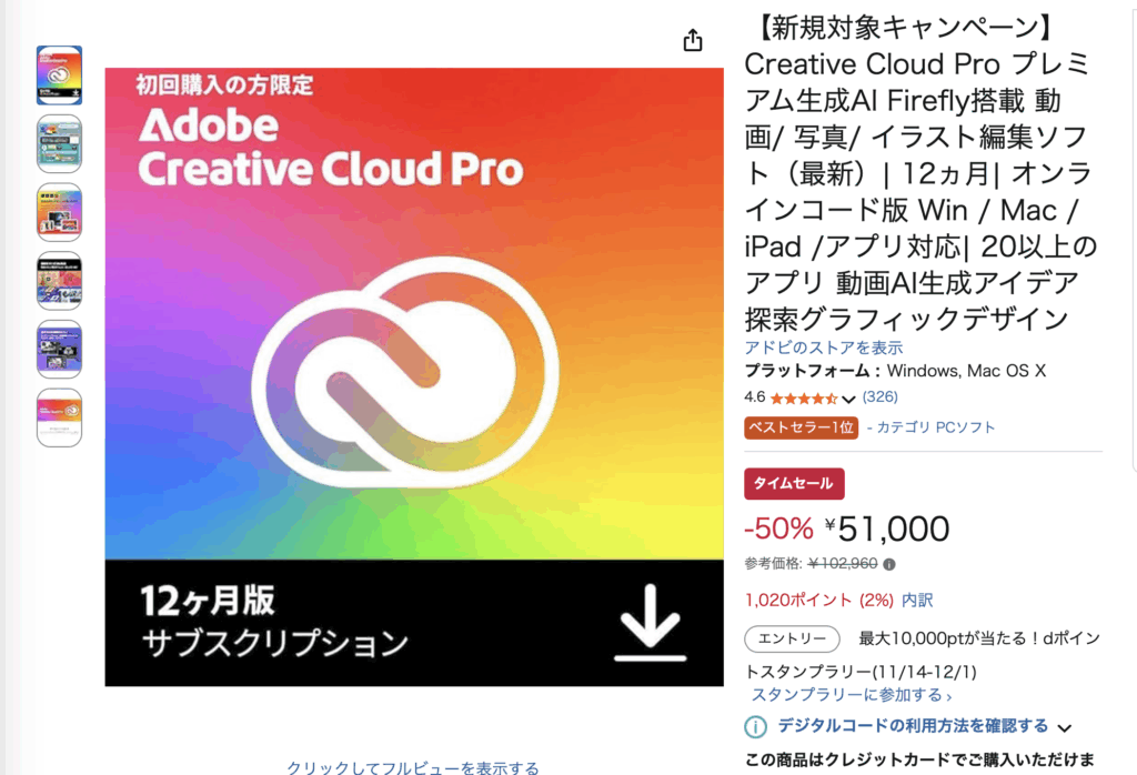 今朝方(と言ってももう昨日ですが)Adobe のCreative Cloud がおかしかったお詫び・・ではないと思いますが、まだブラックフライデーセールも始まっていないのに、AmazonでAdobe Creative Cloud Pro が半額の50%オフで販売されています。