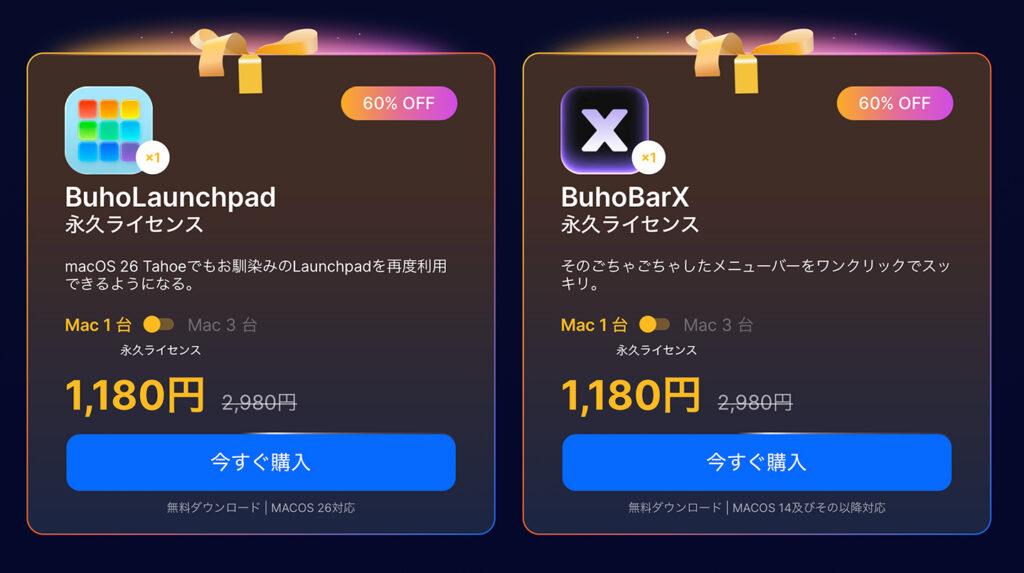 BuhoLaunchpad、公式サイトからダウンロードして7日間試用できるのですが、ブラックフライデーセールとして2,980円が1,180円に。さらに同社からmono-logue用のクーポンを提供頂きました。MONO251101と購入画面で入力すると10%オフになります。
