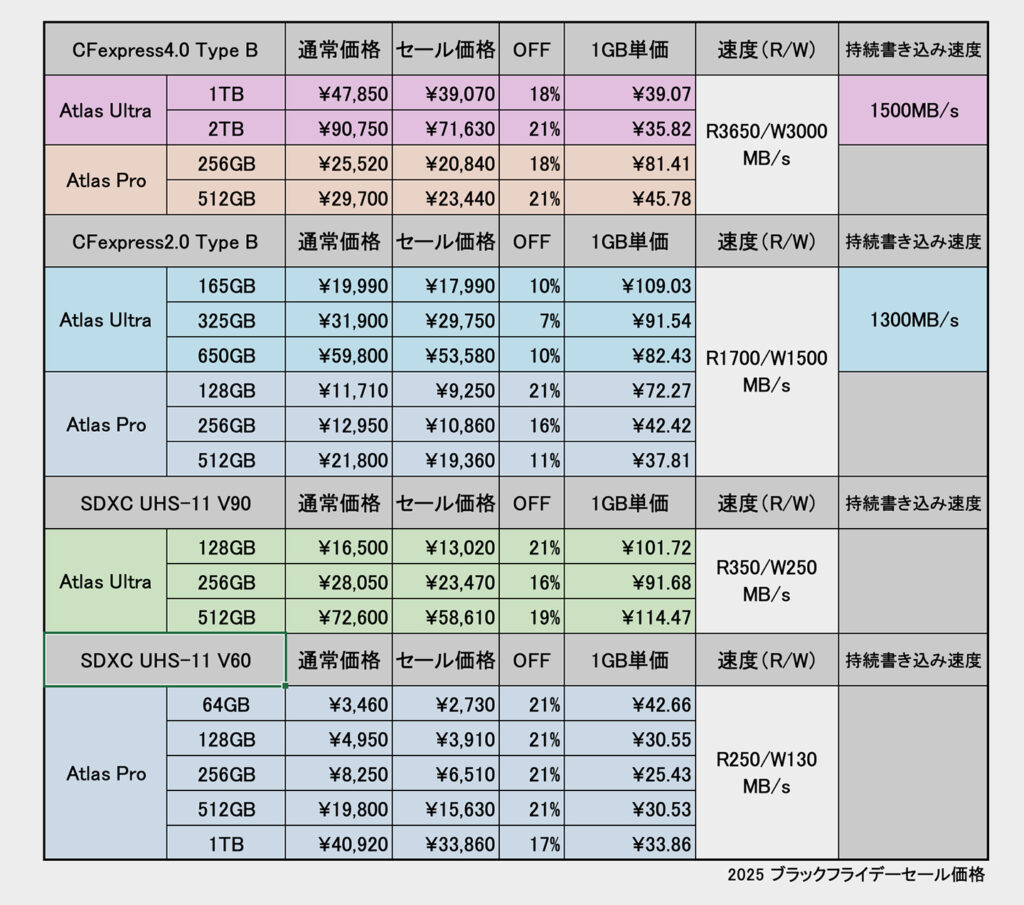 なんだやっぱりCFexpressカードは高価いじゃん、と思うかも知れませんが、SDXC Atlas Ultla V90の256GBとCFexpress 4.0 Atlas Proの256GBはほぼ同じ(SDXCの方が高価い)のに、速度は10倍以上違う(CFexpressの方が速い)のです。もちろんCFexpress4.0カードは現行全てのカメラがフルスペックを活かせないので実効速度で10倍の差はないのですが。その意味ではCFexpress2.0カードで必要十分なのですが悲しいかな1GBあたりの容量単価で言えばもっとも高速なCFexpress4.0 Atlas Ultlaがいちばん安いという・・。