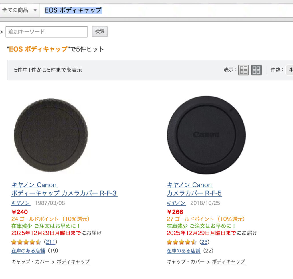 レンズリアキャップはなぜか余分にあるのですがボディキャップは予備は無い。ずっとレンズつけっぱなしなのもなんだし、しかたない、ボディキャップだけ買うか、とAmazonを開く(これがふたつめの間違い)