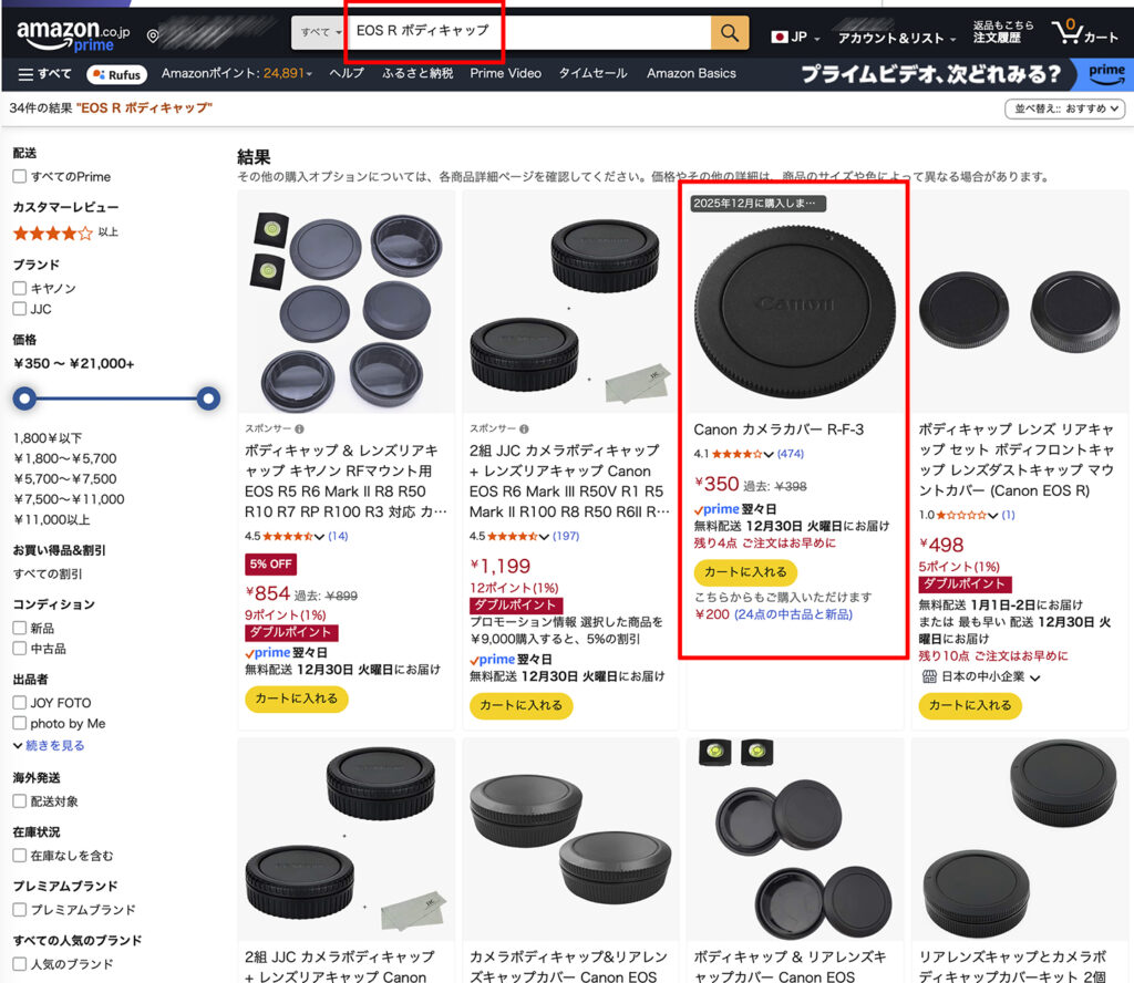 スクショのように「EOS R ボディキャップ」と検索して表示されたのがこれ。Canon カメラカバー R-F-3。ちゃんとCanonロゴも入ってるし、純正品だろうとポチッとしました。