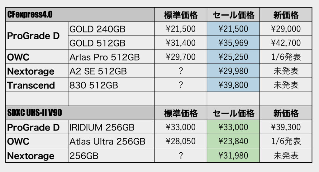 Amazonの初売りスマイルSALEが始まっています。1月7日(水)まで。そして、昨年末書いたように、ProGrade Digital 、Other World Computing(OWC)が翌8日から値上げを行うとリリースを出しています。つまり当面、イマが最低価格ということになるのでしょう。