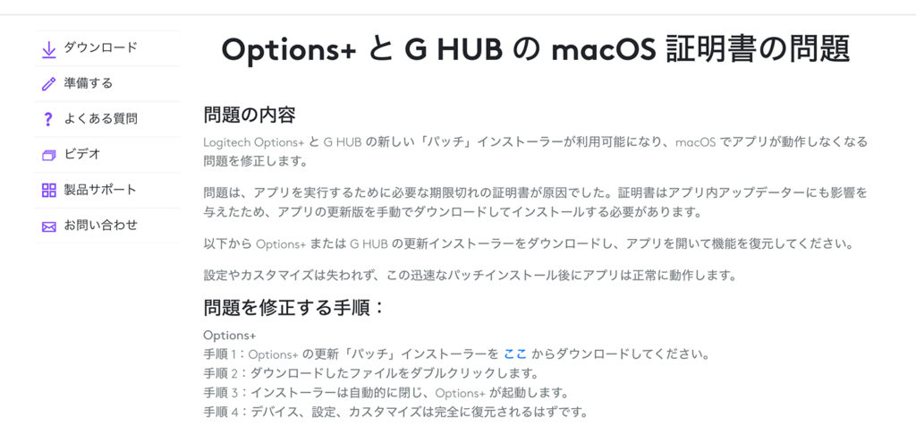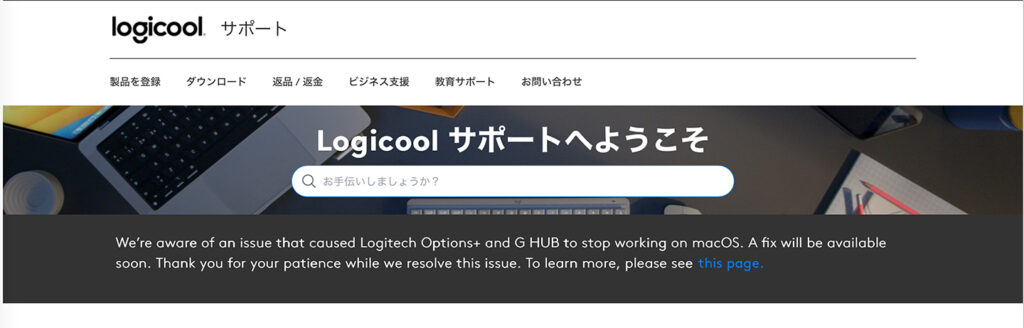 Logicoolのサポートページに