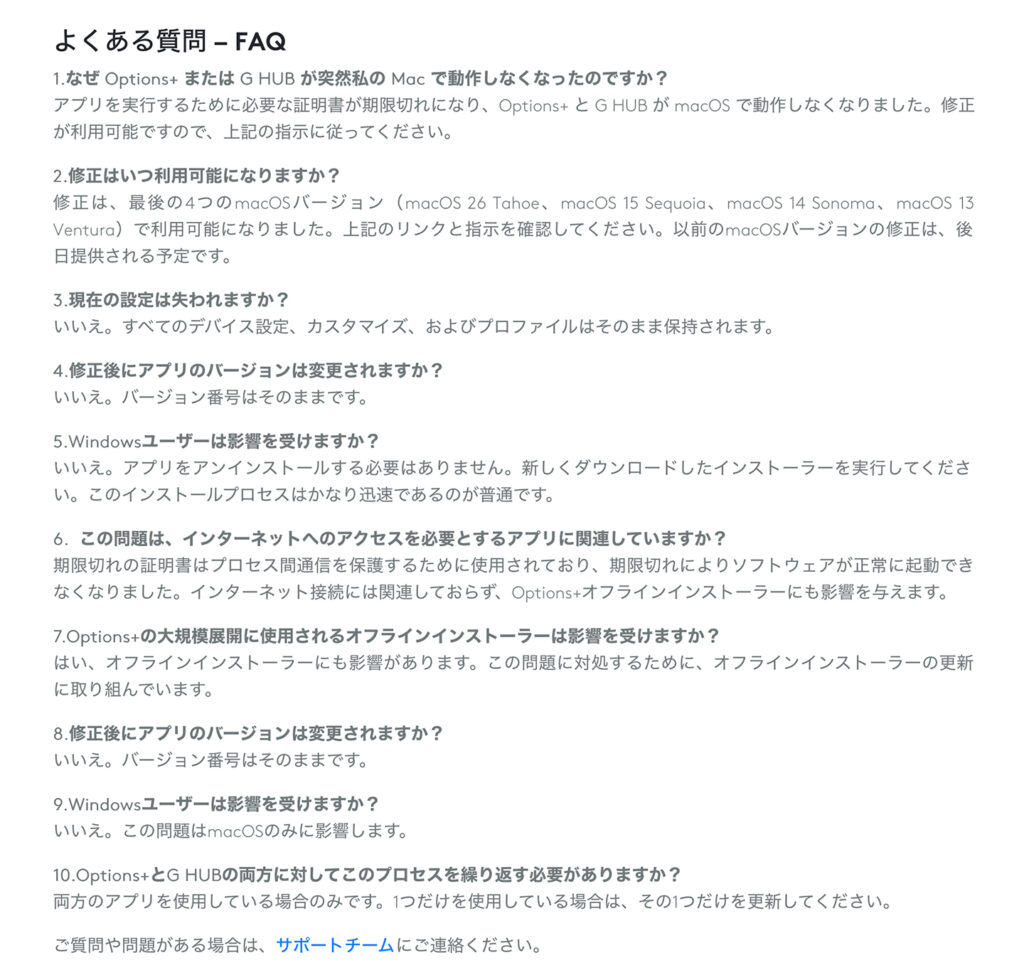 なんかmacOS証明書の問題、と書いてあるから、最初、Apple側の問題かと思ったら、FAQに
