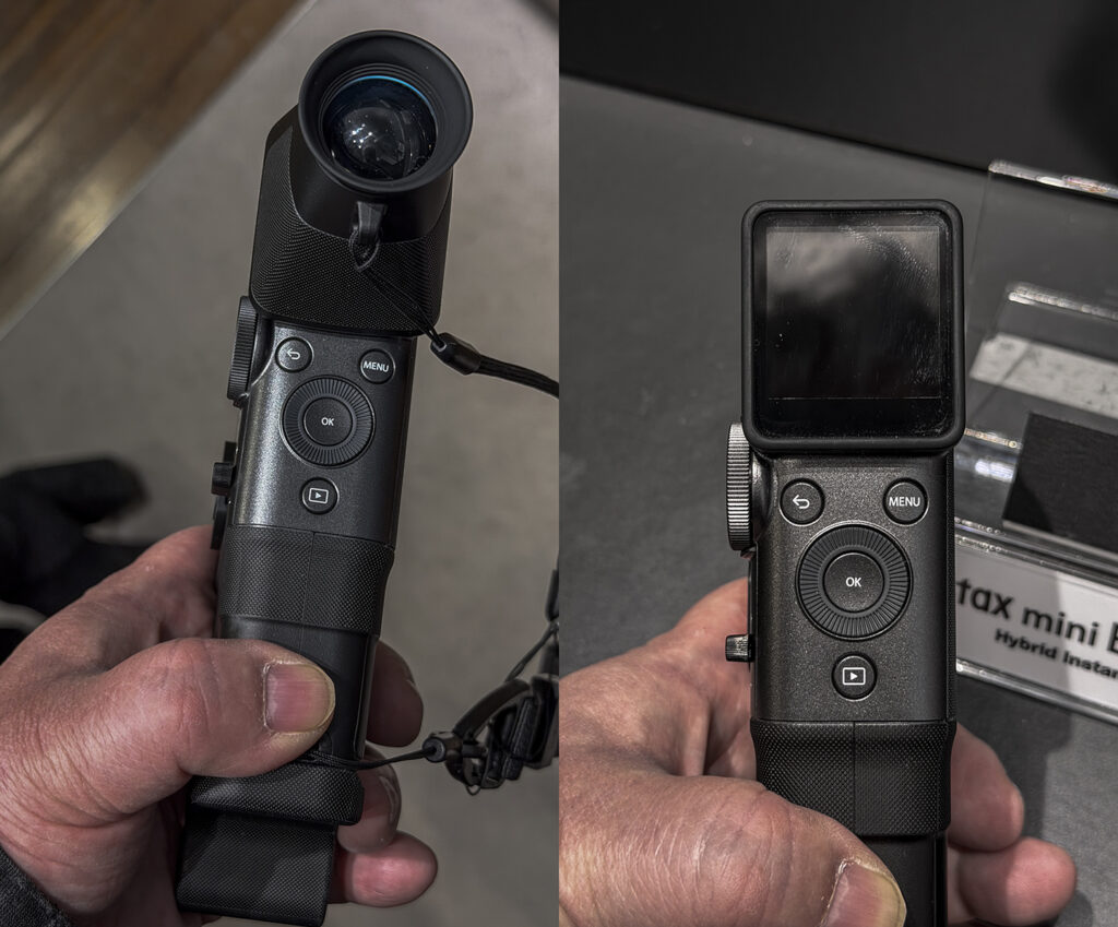 付属アクセサリーの、ファインダーアタッチメント、グリップアタッチメント、ストラップをフル装備したinstax mini Evo Cinema。