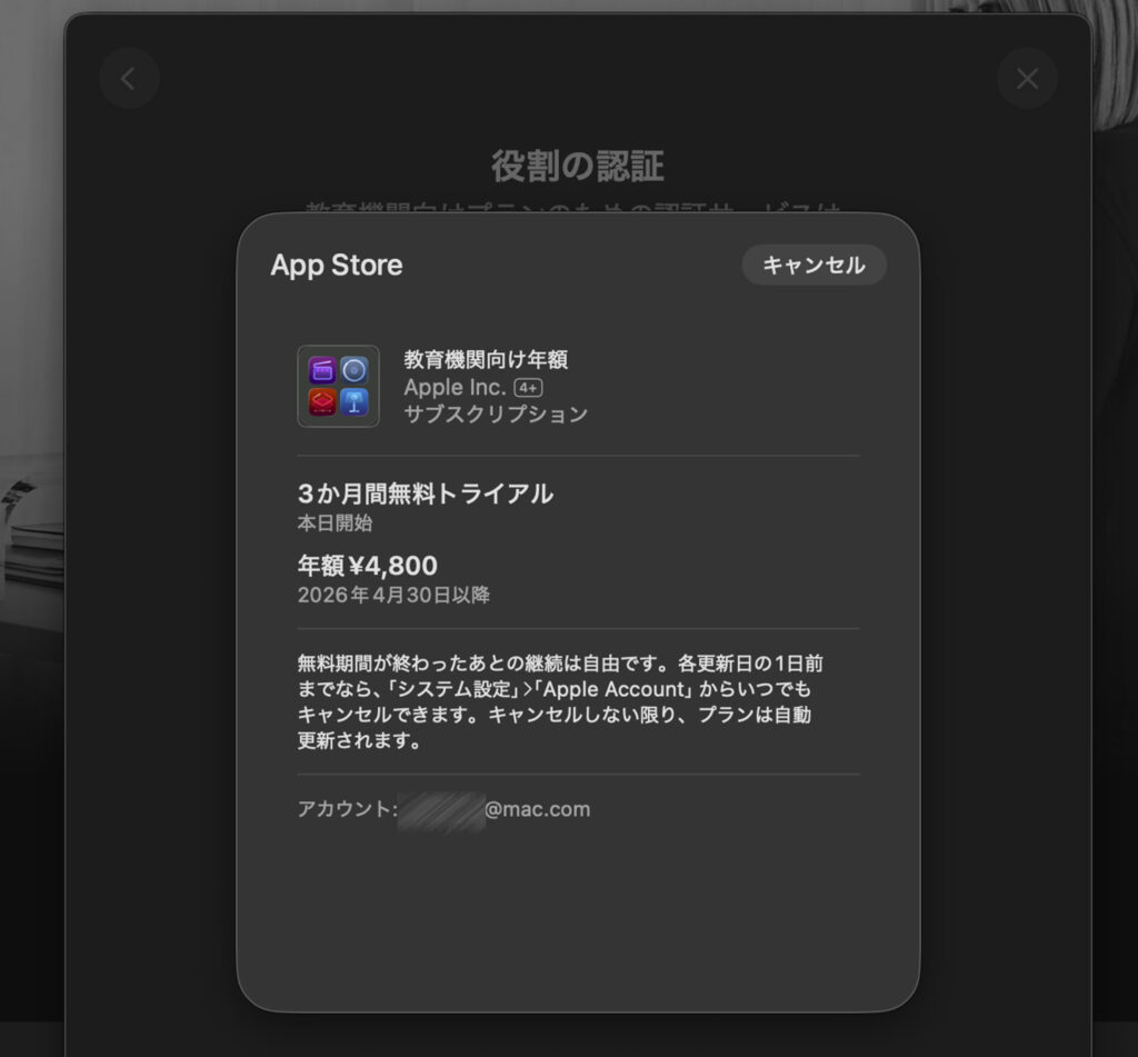 最近、MacBook等を購入した場合は、デフォルトで3か月無料で利用と表示されますが、「その後は1780円/月」と表示され、えっと、アカデミックは?と不安になります。