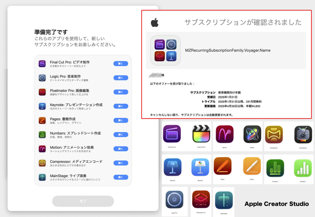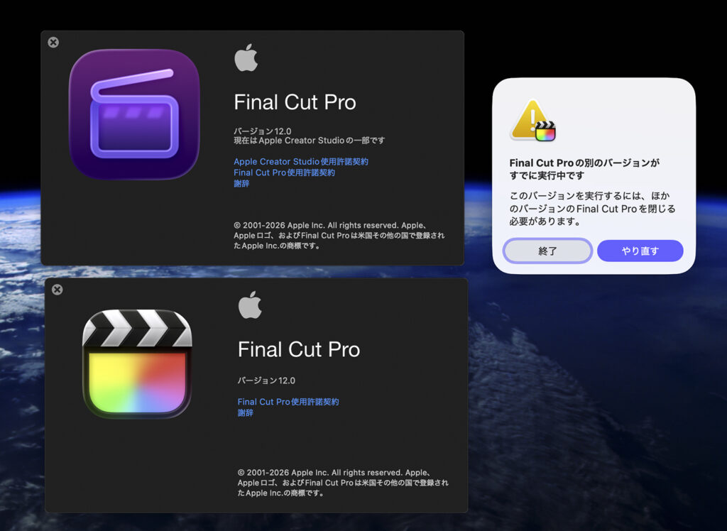 表示が切り替わると同時にメールも届きました。事前に分かっていたことですが、Final Cut Pro、Motion等、すでに持っているアプリとApple Creator StudioでのFinal Cut Pro等は、同じだけど違うアプリとしてインストールされています。