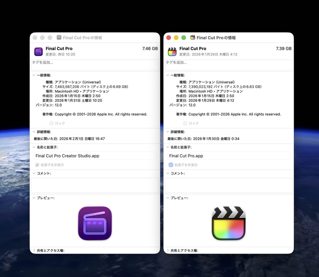 それはいいのですが、例えばFinal Cut Proはそれぞれ7GB近い容量なので両方入ってると従来の倍、のストレージ容量を専有するので、ストレージ小さめのMacだとけっこう深刻な事態になりそうに思うのですが・・。