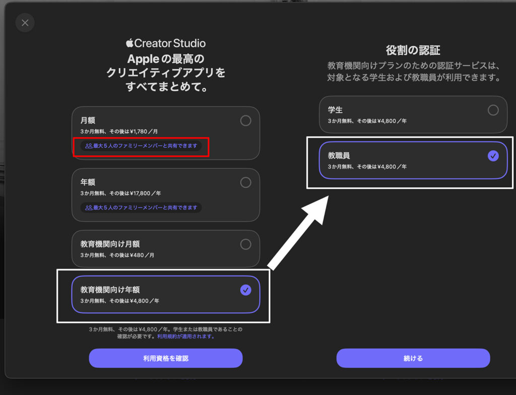 ただし、一般ユーザーはファミリー共有が可能ですが、アカデミックユーザーは出来ません(まあ、当然ですね)
