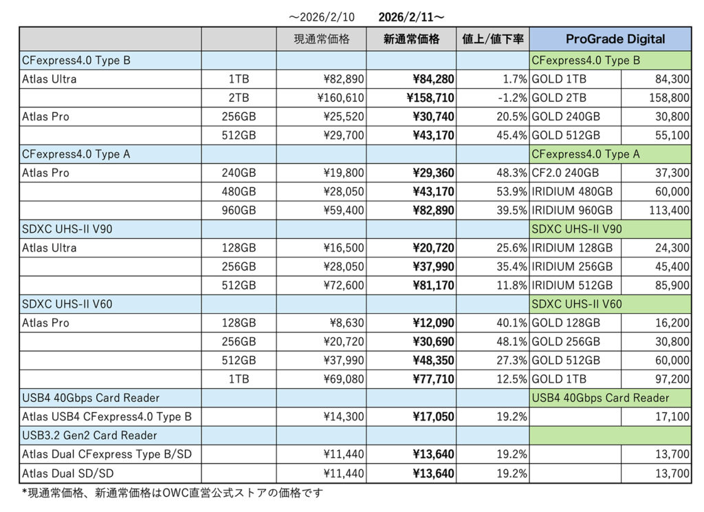 いやいや、OWCがなかりProGrade Digitalを意識しているのが分かります(笑)CFexpress4.0 Type Bなんかはホント僅かでも安いプライスを付けてますね。CFexpress4.0 Type Aはけっこう差がある値付けなのでSONYユーザーはOWCがお得です。