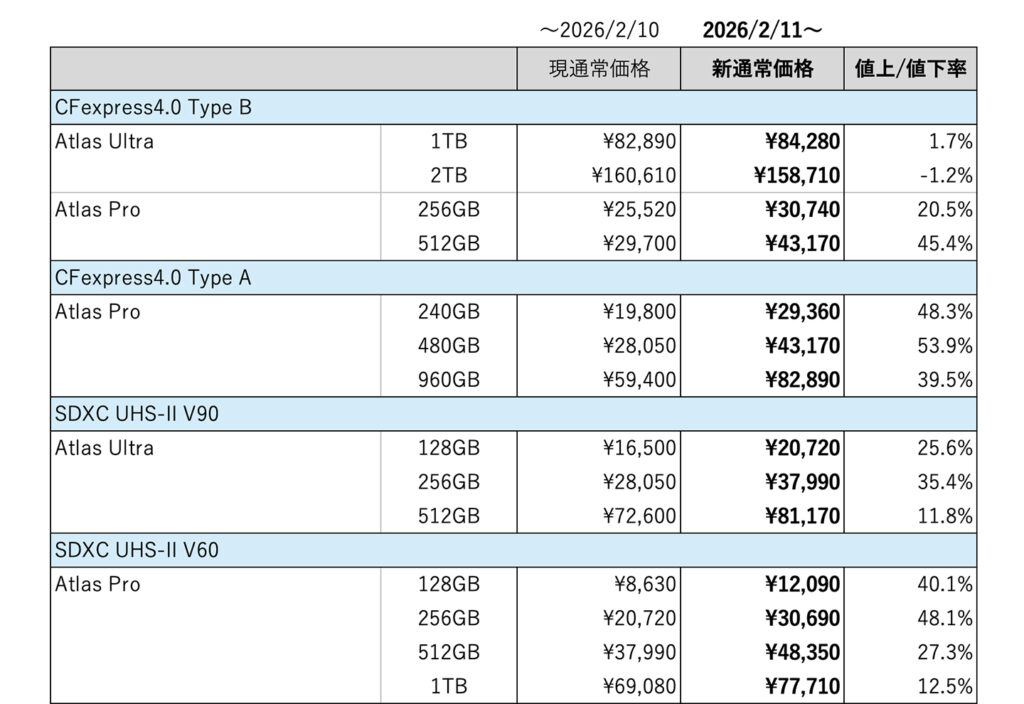 今年早々に値上げしたばかりじゃん、と言いたいところですが、同じくメモリーカードのトップブランドであるProGrade Digitalもつい先日、値上げしたところなのでイヤな予感はしていたのですが。
