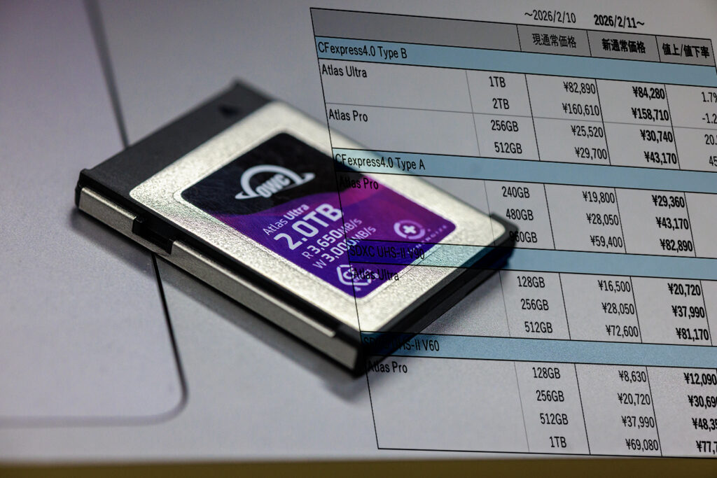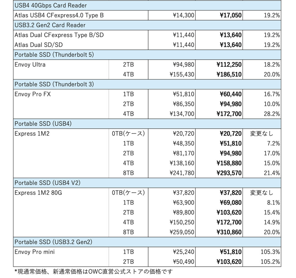 Other World Computing(OWC)が、CFexpress,SDXCといったメモリーカードと、ポータブルSSD(モバイルSSD)の値上げ(2月11日から)を発表しました。
