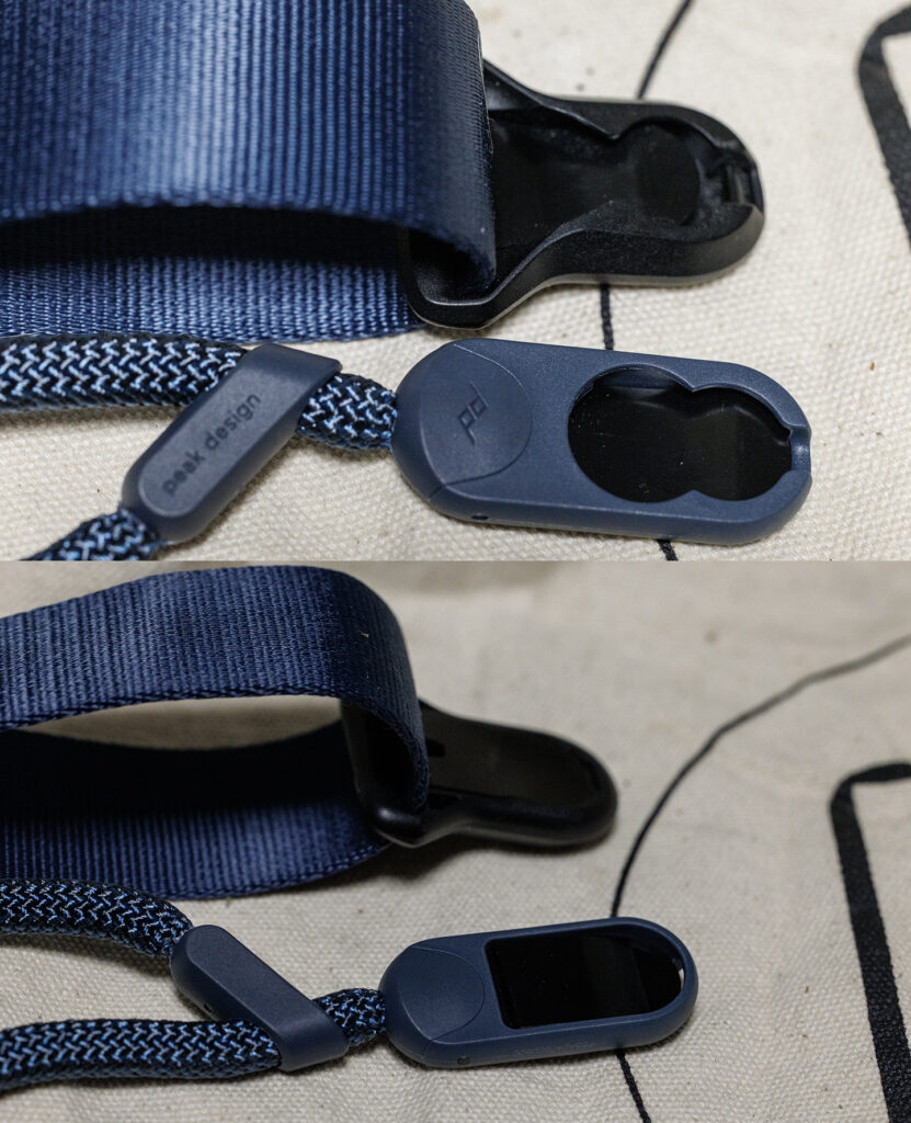 Peak Design Cuff Ropeは、独自開発のロープと新設計のアンカーハウジングを採用と公式ページに書かれているように、従来の同社ストラップとハウジング部の意匠が異なります。ロープとそのまま連続する一体型のフォルムが特徴的です。ただ、ストラップ部と一体型構造なので今後のアンカーハウジングがすべてこうなるとは考えにくいと思います。