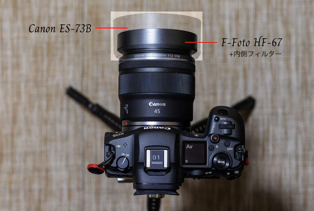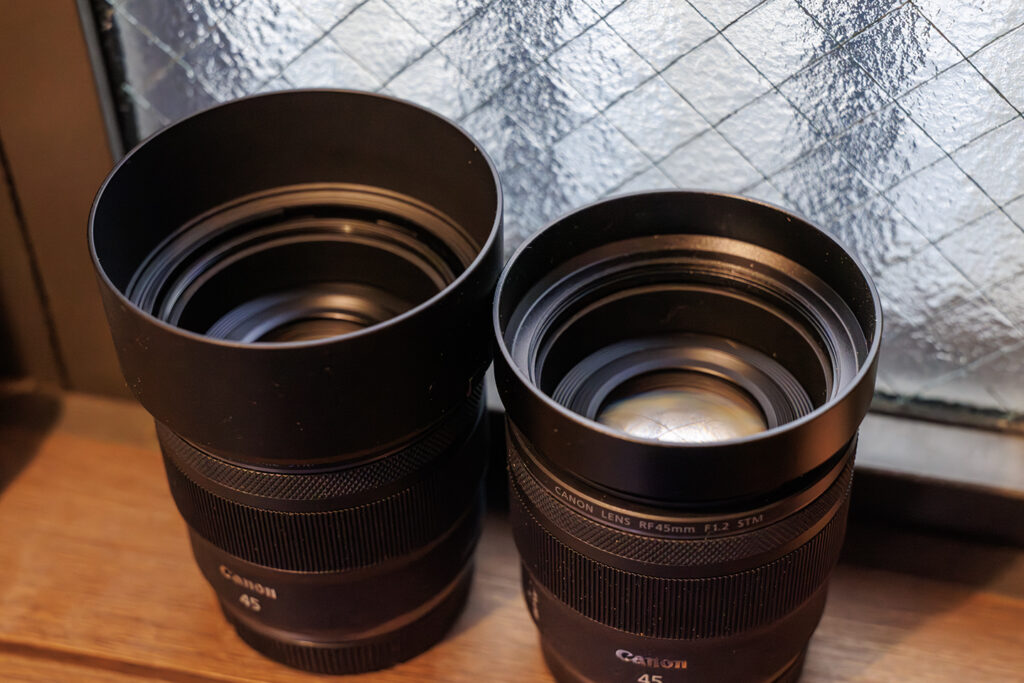 ただ、フードはRF45mm F1.2 STM対応のメタルフード(先行量産型)を送って頂いて使っていたので支障なく、今回、純正フードの到着とともに較べて見ました。