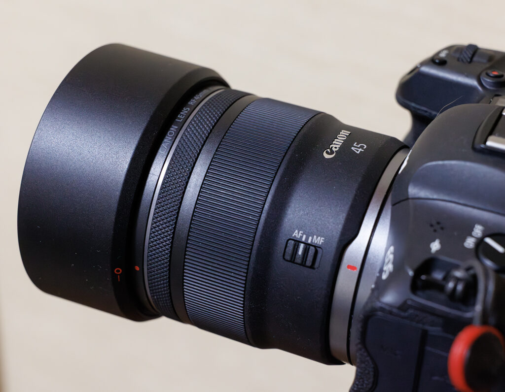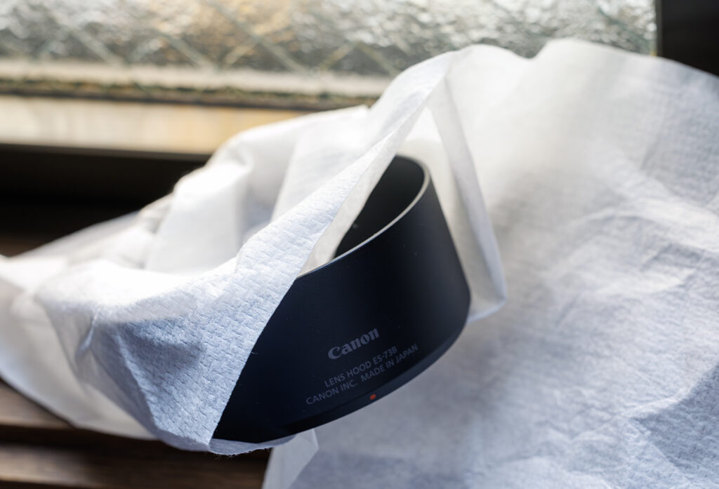 キヤノン RFレンズ 2025年最大の話題作、RF45mm F1.2 STM。レンズそのものは年末ギリギリに届きましたが、純正フードは年度末に届きました。