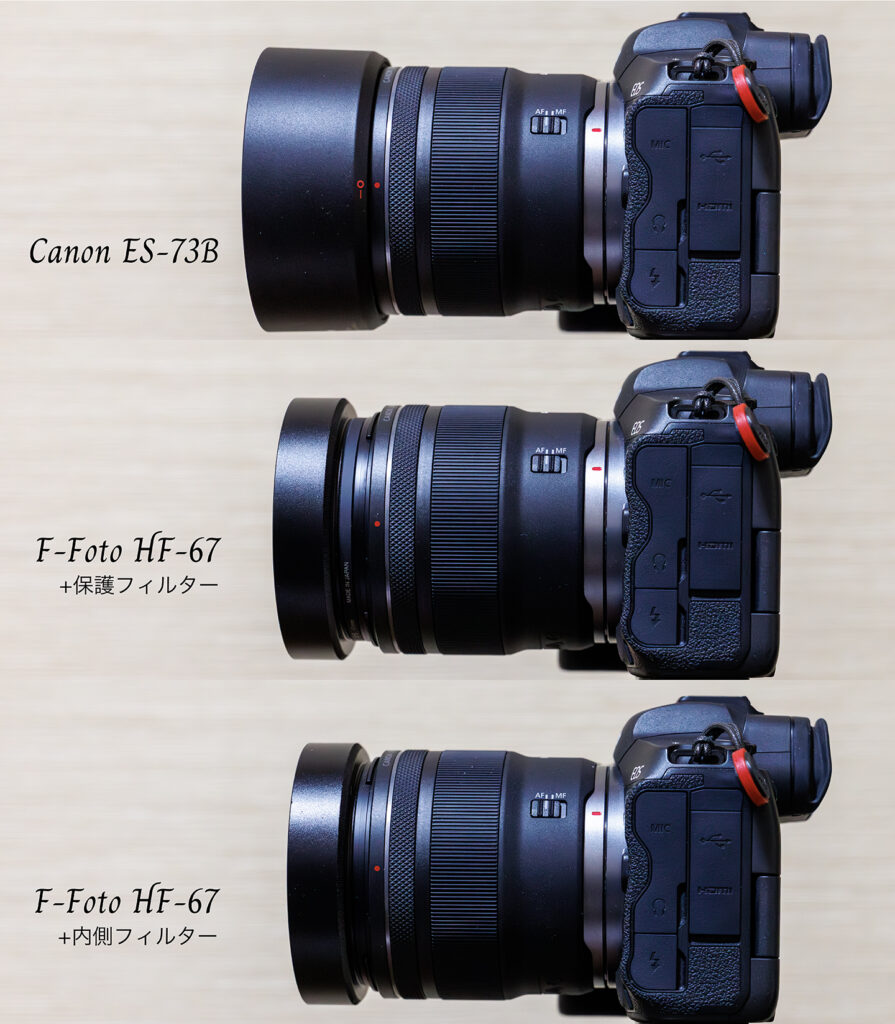 F-Fotoの金属フードは、純正フードに較べ全長が短く、さらにフード内側にフィルターを装着可能(以前書きました)なので、イイ感じの長さになるのが○ ただし、収納時にフードを逆向にレンズに被せることはできないので、そこは注意が必要です。